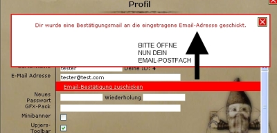 Wie dir bestimmt schon von unserem Zwerg mitgeteilt wurde, ist es notwendig, die in deinem Profil eingetragene Email Adresse zu bestätigen. Aus Datenschutzgründen ist es wichtig, die Adressen zu beglaubigen, bzw nachzuprüfen. Wir vermeiden damit auch die Möglichkeit, dass dir andere User nicht erwünschte Nachrichten zukommen lassen. Das Versenden von Fremdwerbung oder anderen Spam-Nachrichten per IGM (= InGameNachricht) wird dadurch erschwert und minimiert.